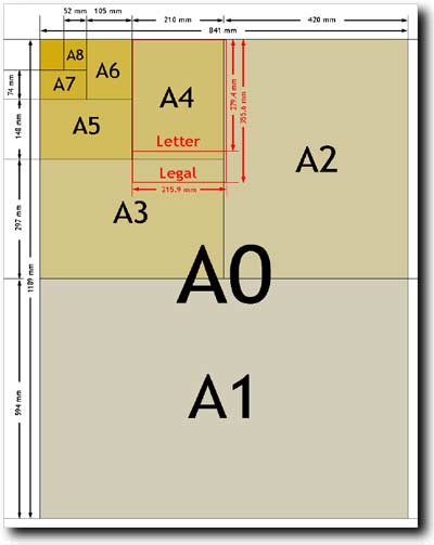 El formato de referencia para la “serie A”, la mas utilizada, es el A0 que tiene una superficie de 1m2 (84,1 x 118,8 cm). A partir de ese “pliego original” las medidas restantes corresponden a la mitad del número anterior, siendo el A1 la mitad del A0, el A2 la mitad del A1, y así sucesivamente; hasta el A8 (como medida mínima más usada) del tamaño de una tarjeta de visita. Medidas en mm: